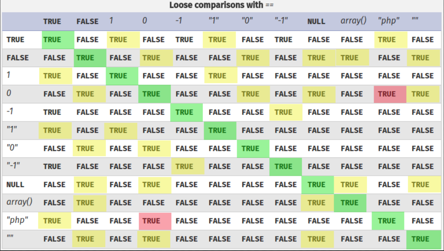 If the application is written in PHP and is older than PHP 8, when the user submits JSON data, a type juggling vulnerability can exist. This vulnerability occurs when the user input is compared using a loose comparison (==) rather than a strict comparison (===). The user can control the type of their input by submitting a JSON parameter value as an integer without quotes, which the program will treat as an INT instead of a string. If the application implements loose comparison, the table below displays some comparisons that can be used.
