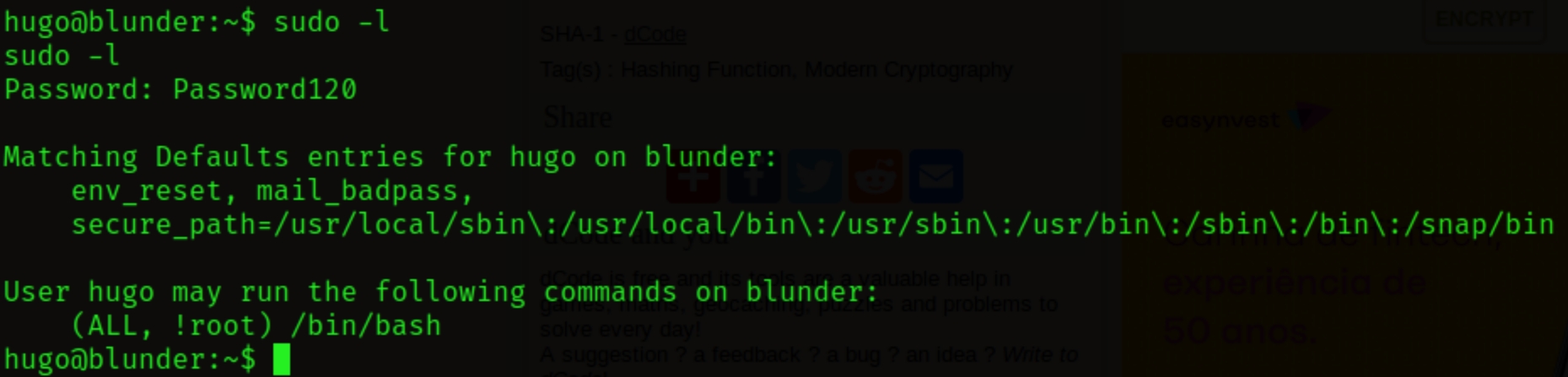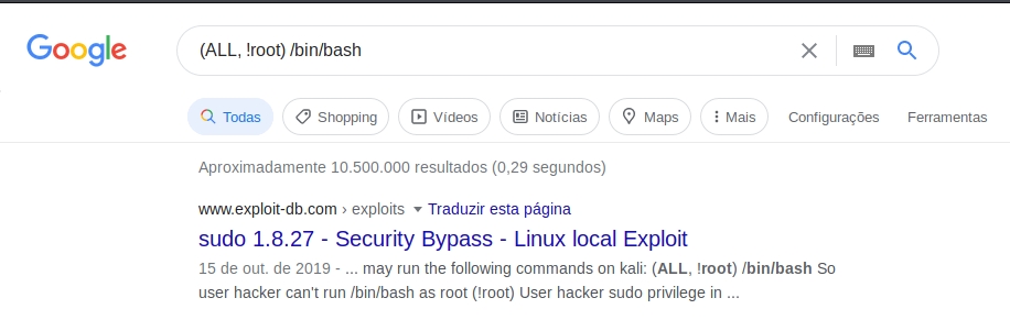 to see what command we can run as root without password, we see that the hugo user can use the command "(ALL, !root) /bin/bash"