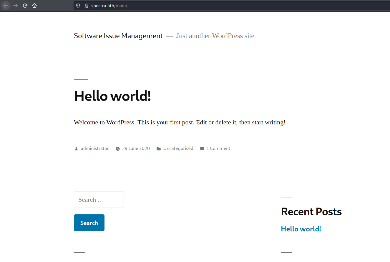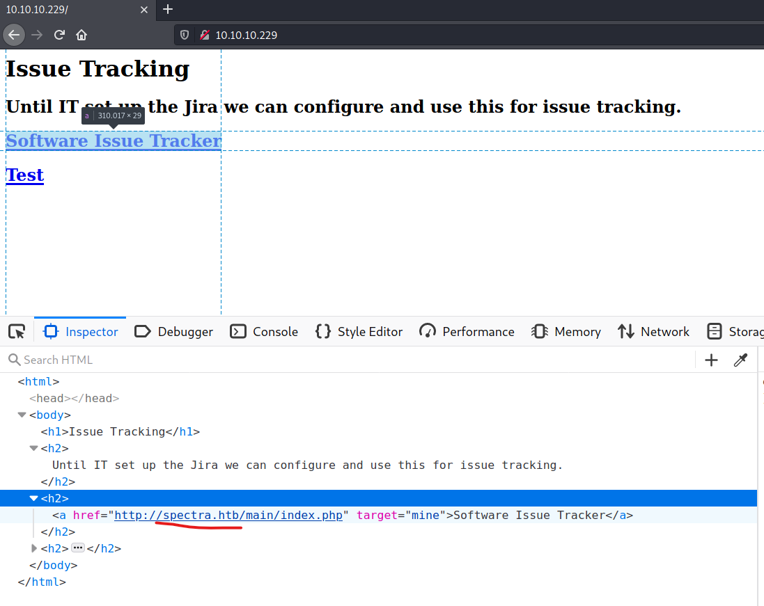By clicking on any of these links, we are redirected to a hostname (spectra.htb).