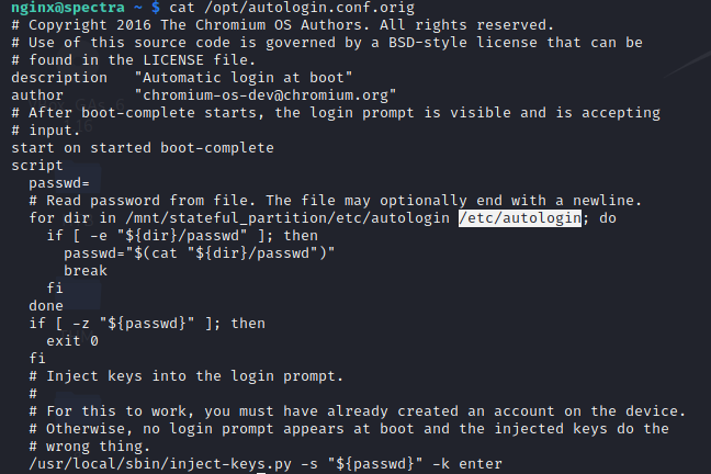 looking at this configuration file we have that in "/etc/autologin/passwd" there is probably a password.