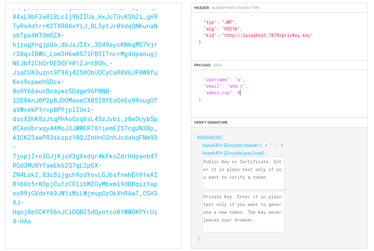 auth=eyJ0eXAiOiJKV1QiLCJhbGciOiJSUzI1NiIsImtpZCI6Imh0dHA6Ly9sb2NhbGhvc3Q6NzA3MC9wcml2S2V5LmtleSJ9.eyJ1c2VybmFtZSI6ImEiLCJlbWFpbCI6ImFAYS5jIiwiYWRtaW5fY2FwIjowfQ.X4xL9bF3x0l8Lclj9hIIUa_HxJcTUvKSh2i_gH9TyRs4d1rrK2TXR0AxYiJ_BL5ytJr0VdqQNKunaNobTps4NTOmOZX-hjzugYngjpUo_dbJsJIXx_3D49aycKN6qMS7VjrrS8qvZBWU_Lom3H6w057lFB3ITncrMg4UpaougjNEJbfZChQrDEDGEY01ZJntBOh_-JiaCUA3uznt9T98j425XObUDCyCaR0VUJF0W8fuKes9cpwehQDcx-0o9Y66aucBcaywz5Ddge96P0NB-l2E8AnJ0P2p8JDOMaoeCX05I8YEoGeEu99ougOfaVWxekP1nvpBPYjplIUxi-dscXShK8zJtqPHAoOzqVsL4SzJvbi_z8eDUyb5p0CAoUbrxqy44MoJ3JWWER781iemEISTcgUN3Bp_AlCK23awPR3ikzpz18QJZnHnCGnhJcdxhqFNm93-7jopjIroIGJjKjsV3gVxdqr4kFkoZdrHdpaob47RQd3MU0YfawEk6ZQ7qL2pGX-ZN4LskZ_83c5ijgch9zdYovLGJ6sfnwhEh91eAIR16Uz5rKDpjCu1zCOlibMZGyMbxml9dBBqiz1apoo99jGVdeYA9JW1iMiLWjmvpGzOkXhRAwT_OSH3XJ-Hqoj8eSCKY56nJCiDQ0Z5dQyntco01WWOKPYrUi4-HAs